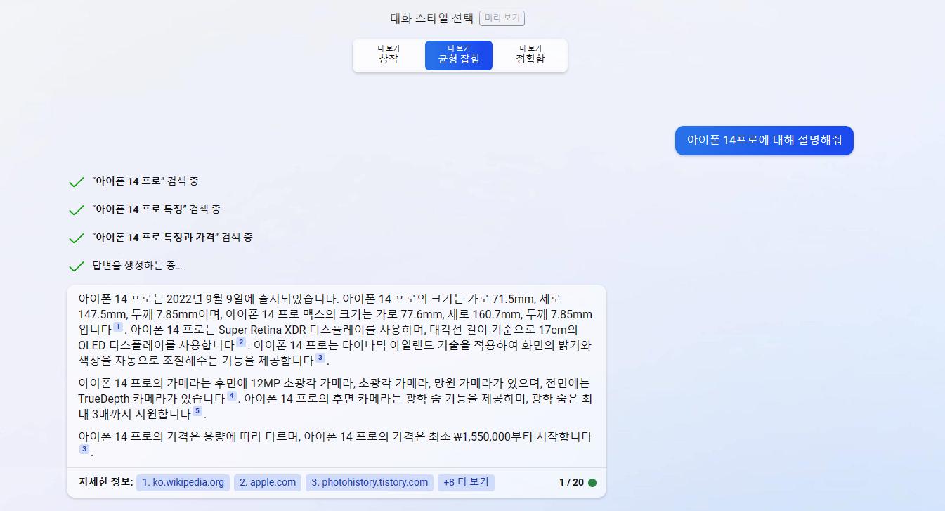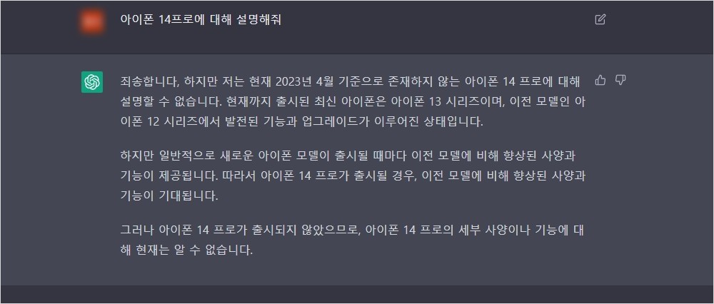 필자가 챗 gpt 3.5에서 아이폰 14프로에 대한 답변을 했을 때는 죄송하다 아직 출시되지 않았다라는 내용으로 답변을 출력했으나 Bing 챗 gpt는 아이폰 14프로에 대한 답을 했다.