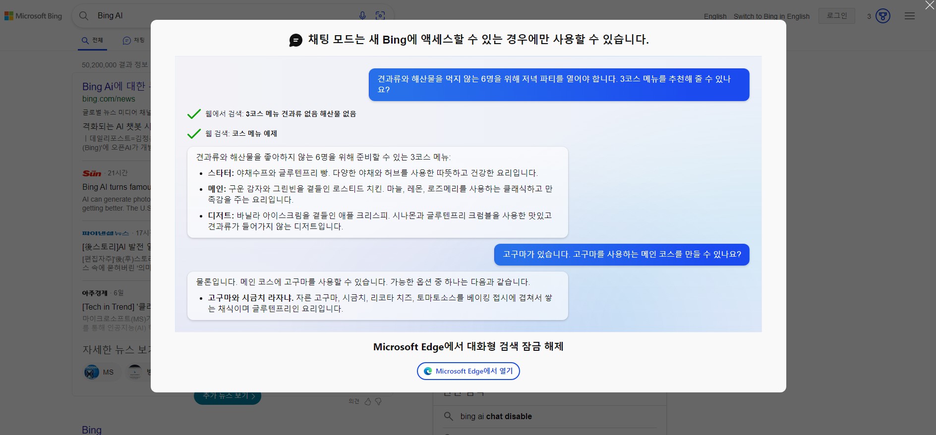 위에서 언급했듯 Bing에서 챗 gpt를 사용하려면 MS에서 만든 브라우저 엣지가 필요하다. 보통 윈도우 10이상을 사용하고 있다면 윈도우에 자동으로 설치되어 있겠지만 다른 운영체제를 사용한다거나 엣지가 없다면 다운받아 설치가 필요하다. 하단에 있는 Microsoft Edge에서 열기를 클릭하자.