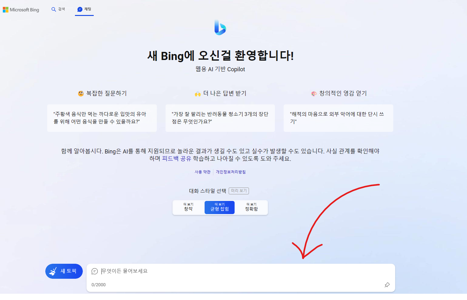 빙에 접속해 상단에 채팅을 클릭하면 Bing 챗 gpt를 사용 할 수 있다.
