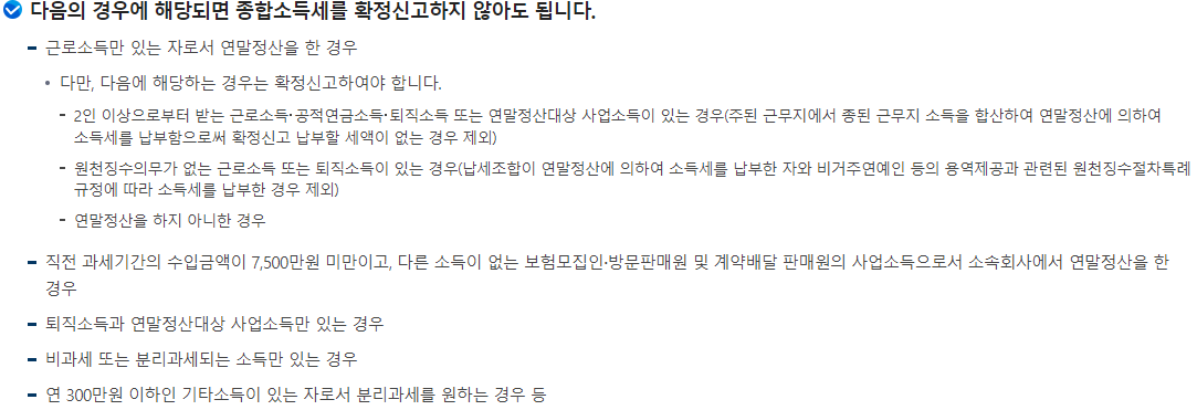 그러나 직장에서 근로소득을 받고 있어도 여러이유로 인해 근로소득외 소득이 발생하게 되어 종합과세 대상이 된다면 5월에 있는 종합소득세 신고 납부를 해야 한다. 그러나 연간 2천만원을 초과하지 않는 금융소득이 있거나, 연간 2천만원 이하의 부동산 임대소득만 있거나, 1,200만원 이하의 사적 연금을 수령했다면 종합과세가 아닌 분리과세를 선택할 수 있다.