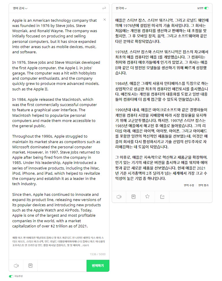 뿅하고 대답을 내는 것이 아니라 타이핑 하듯 한글자 한글자 글을 써내려 가니 잠시 기다리면 다섯문단 영타기준 1536자의 글을 1분만에 완성시켰다. 챗gpt의 답변을 가지고 다시 파파고로 돌아와 한글로 번역하면 아래와 같은 화면을 보여준다.
