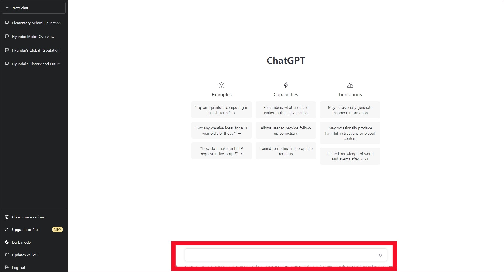 Try ChatGPT를 클릭하면, 로그인 또는 회원가입을 해야 하는 화면이 나오는데 필자는 이미 회원가입을 해놓은 상태라 Log in 버튼을 눌러 ChatGPT 화면에 접속했다. (회원가입을 하지 않았다면, Sign up 버튼을 누르면 간단히 회원가입을 할 수 있다.) 빨간색 네모박스로 체크해둔 곳이 대화를 입력하는 창으로 궁금한 것이 있다면, 이 곳에 질문을 하면 된다.