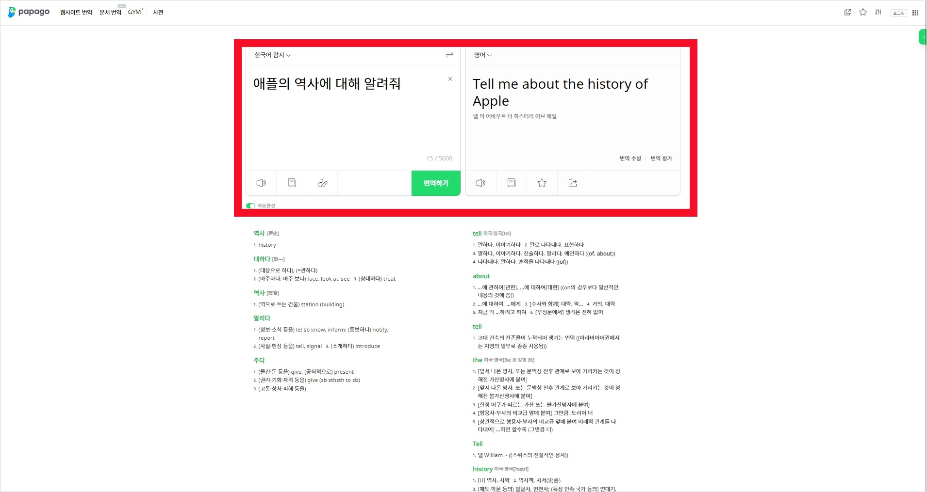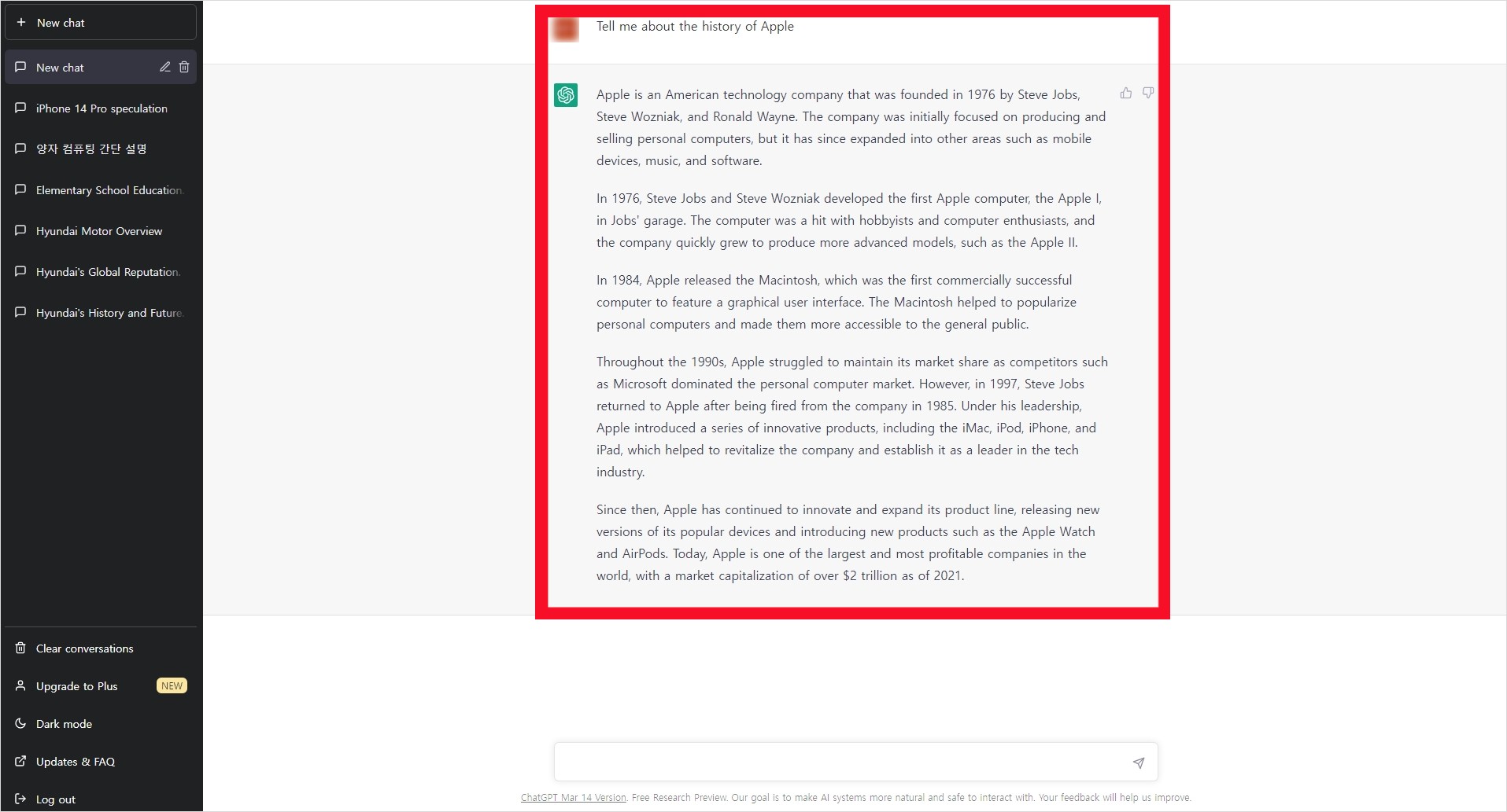 영어로 질문을 하는 것이 좋다. 영어 실력이 좋다면 영어로 질문을 바로 하면되고, 필자 처럼 영어에 약하다면 각종 번역 프로그램을 사용하면 된다. 필자는 파파고를 이용해 애플의 역사에 대해 질문했다. 파파고에서 번역한 영어를 복사해 챗gpt 대화창에 입력해 보자.