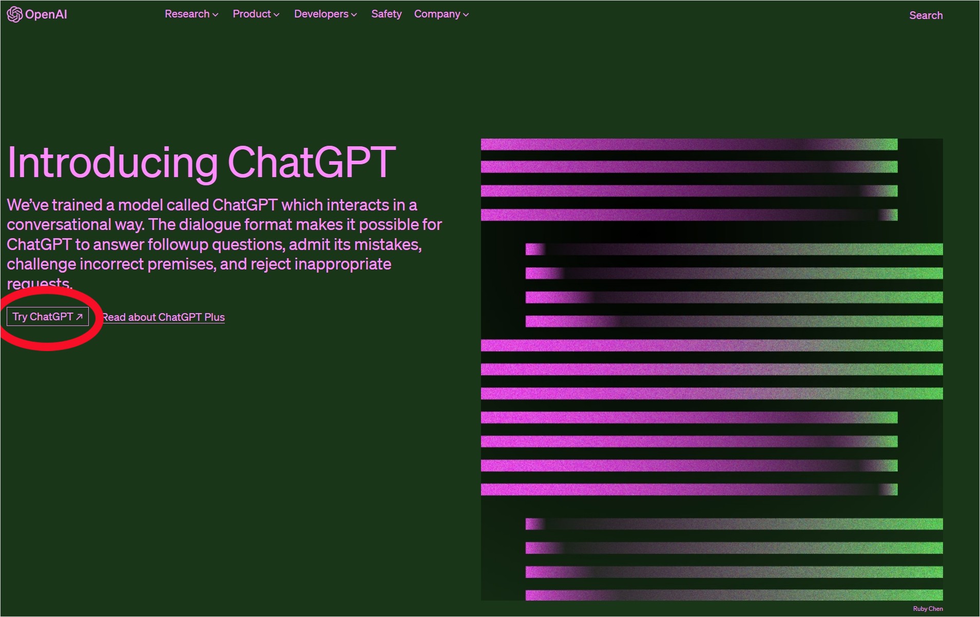 챗gpt에 접속하면 위와 같은 메인 페이지를 만나게 된다. 빨간색 원으로 표시된 Try ChatGPT를 클릭해보자.