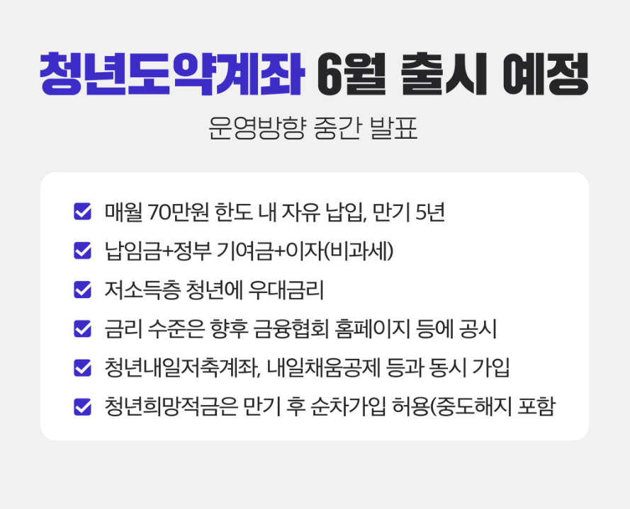 | 월 70만원씩 5년 동안 저금하면 5000만원을 만들 수 있는 청년도약계좌 6월 출시전 미리 알아보고 준비하자! |