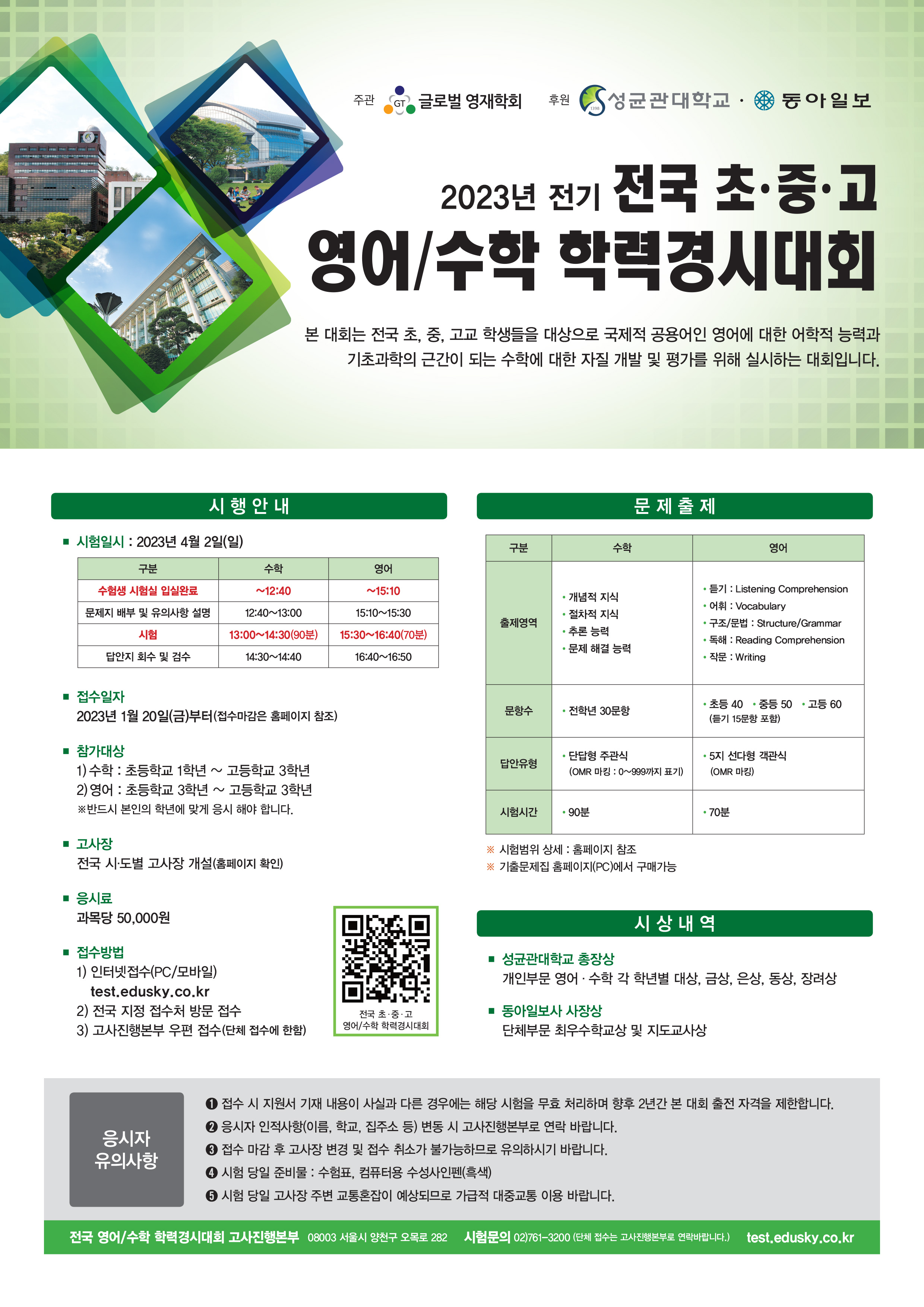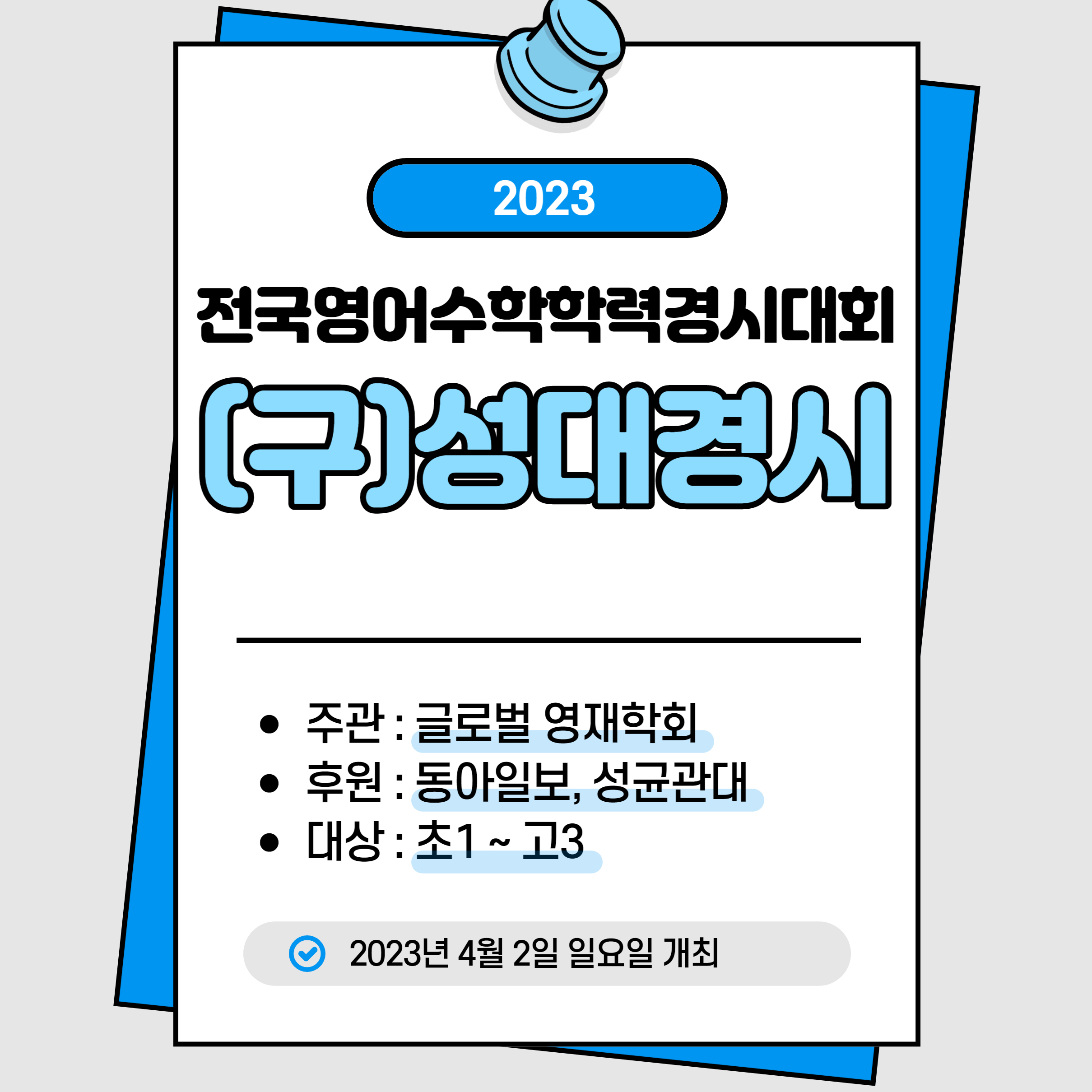 2023년 4월 2일 일요일에는 전국영어수학학력경시대회, (구)성대경시가 열린다. 글로벌 영재학회를 주관으로 동아일보와 성균관대가 후원하는 경시대회로 2019년도부터 이름이 변경되었다. 성균관대가 주최자에서 후원자로 변경되었고, 종로학원으로 유명한 하늘교육에서 주관하는 시험이었다가 선행금지법 도입이후 대학이 선행학습을 부추긴다는 여론의 질책을 받고 한발 물러선 결과이다. (그러나 아직도 접수는 종로학원에서 받는다.)