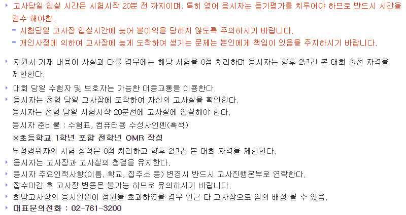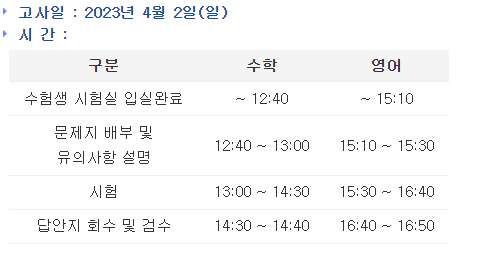 수학은 13시, 영어는 15시 30분에 시험을 시작하지만 20분전까지 입실해야 한다. 대학 논술고사 시험날 만큼은 아니지만 당일 교통문제로 인해 가능하면 대중교통을 이용해야 좋다. 하지만 아이가 어리거나 교통이 불편해 차량을 이용한다면 주차문제가 있을 수 있으니 미리 미리 움직이자.