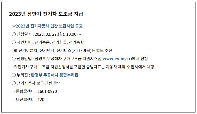 | 2023년 서울시 전기차 보조금 금액이 확정됐습니다. 상반기 보급 1만 2,053대에 대한 보조금을 지금하는데 승용차는 최대 860만원, 화물차는 최대 1,600만원까지 지급 받을 수 있습니다. 보조금 금액과 지원절차를 꼭 확인하시고 전기차 구매 계획을 세우시길 바랍니다. |