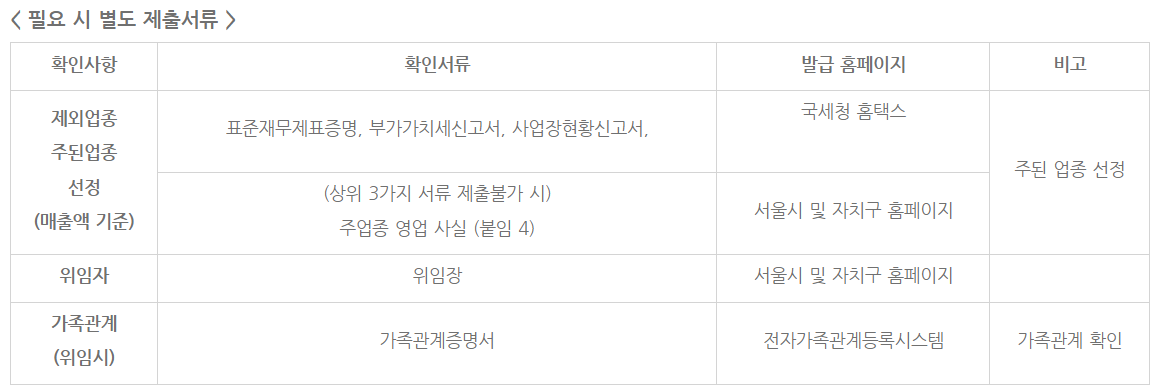 | 1 | 신청서 | 서울시 또는 자치구 홈페이지 | 위임 불가(직접신청) | |